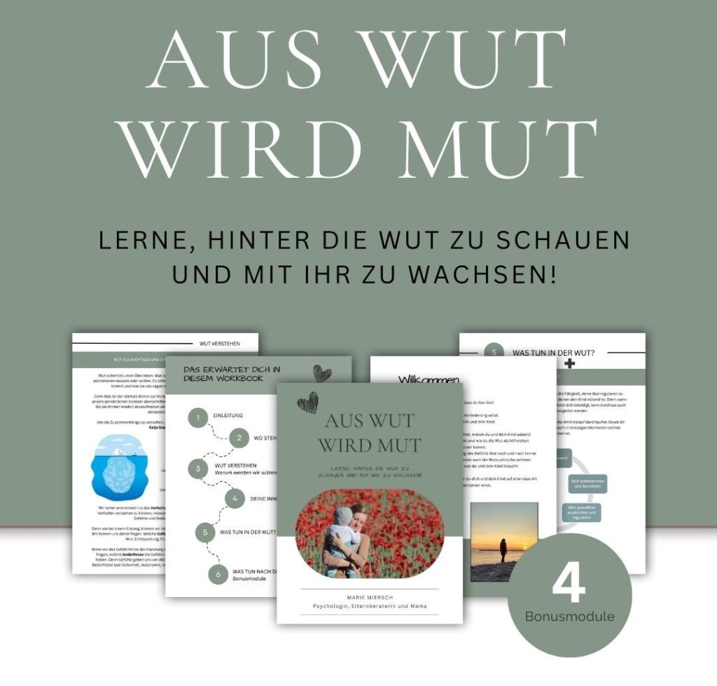 In meinem Workbook „Aus Wut wird Mut“ zeige ich dir, wie du dein Kind sicher UND bedürfnisorientiert durch Wutanfälle begleitest, ohne auf alte Erziehungsmethoden (wie „Wenn du nicht sofort aufhörst, dann…“) zurückgreifen zu müssen.